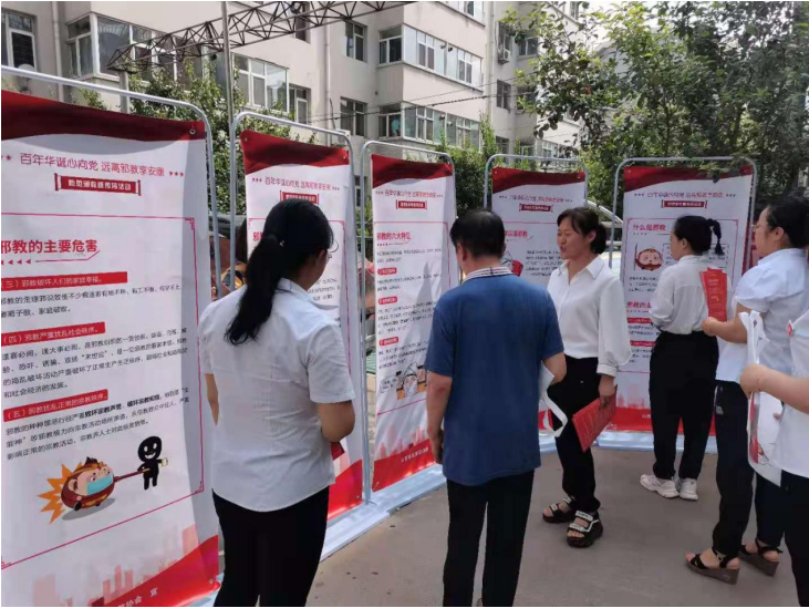 在活动现场,志愿者们通过悬挂横幅,展示反邪教宣传展板,并就“什么是邪教”“邪教的危害”以及“邪教的主要特征”等知识进行了详细的讲解,提醒广大群众千万别信邪教“不劳而获”“有病只要练功不用喝药!……”的鬼话和荒谬论调,要相信科学,有病早治、无病早防,只有辛勤付出、脚踏实地、实事求是才能过上幸福的生活。